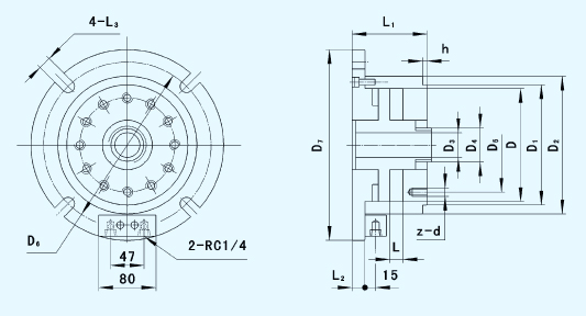 注:可根據(jù)用戶要求,設(shè)計與K51、K54等系列動力卡盤配套的立式固定油缸。